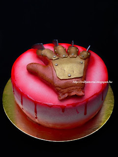Freddy Krueger kitallt szerepl a Rmlom az Elm utcban cm horrorfilmbl. egy eltorzult arc, pengs kesztyvel elltott sorozatgyilkos aki rmlmaikban vgez ldozataival. Hozzm mg mindig a rzsaszn, babs, virgos, cuki tortk llnak kzel, egyszval nem a szvem cscske tortt ltjtok most. Konkrt kp alapjn ksztettem el amit a szletsnapos mentett le egy klfldi oldalrl. A torta tejsznes trkrmmel lett megtltve. A keszty kekszmasszbl kszlt amit szintn leburkoltam, utna jttek r a kiegsztk. A kesztyt s a tortt airbrush-al festettem le, a keszty tbbi rszt egy ecset segtsgvel (penge s egyebek) alkoholba feloldott lszterfestkkel. A "vr"pirosra festett hidegzsel.