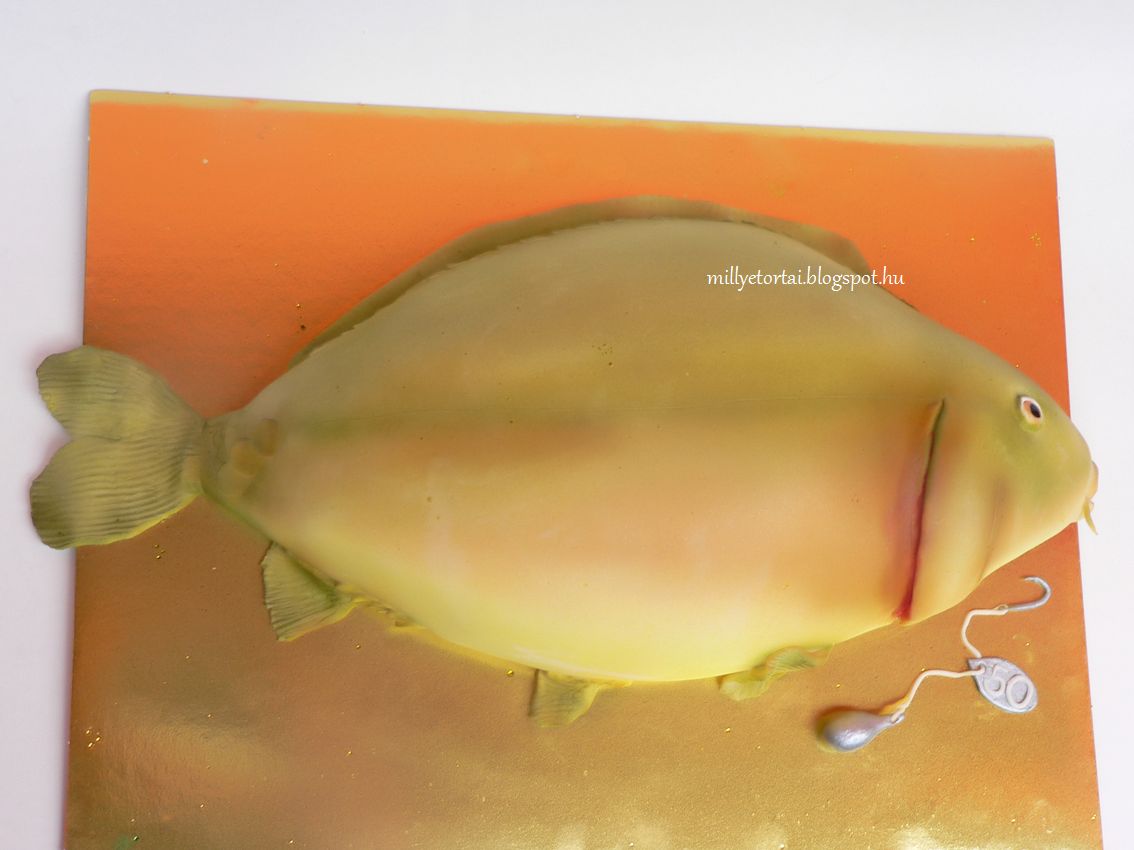 Pr vvel ezeltt sokszor elmentnk peczni a frjemmel s a nagylnyommal. Pihens, j leveg s a kifogott halak lmnye mr csak hab volt a tortn. Kicsit nosztalgiztam ma mikzben faragtam ezt a ponty alak tortt. A horog, bilta s "lom" sly cukormasszbl kszltek. A halacskt airbrush segtsgvel fjtam le.