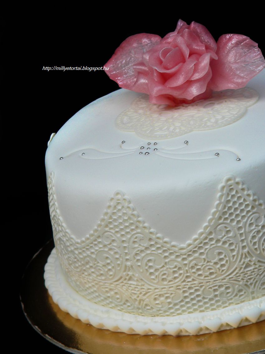 Egy jabb cukorcsipks, karamellrzss torta. Tejsznes trkrmmel lett megtltve a piskta ami kz ismt ropogs csokirteget tettem. A torta tetejre (is) kerlt cukorcsipke, ezst szn cukorgyngyk valamint egy rzsaszn karamell rzsa. Nekem nagyon bejnnek az ilyen s hasonl tortk, remlem nektek sem unalmasak. :)