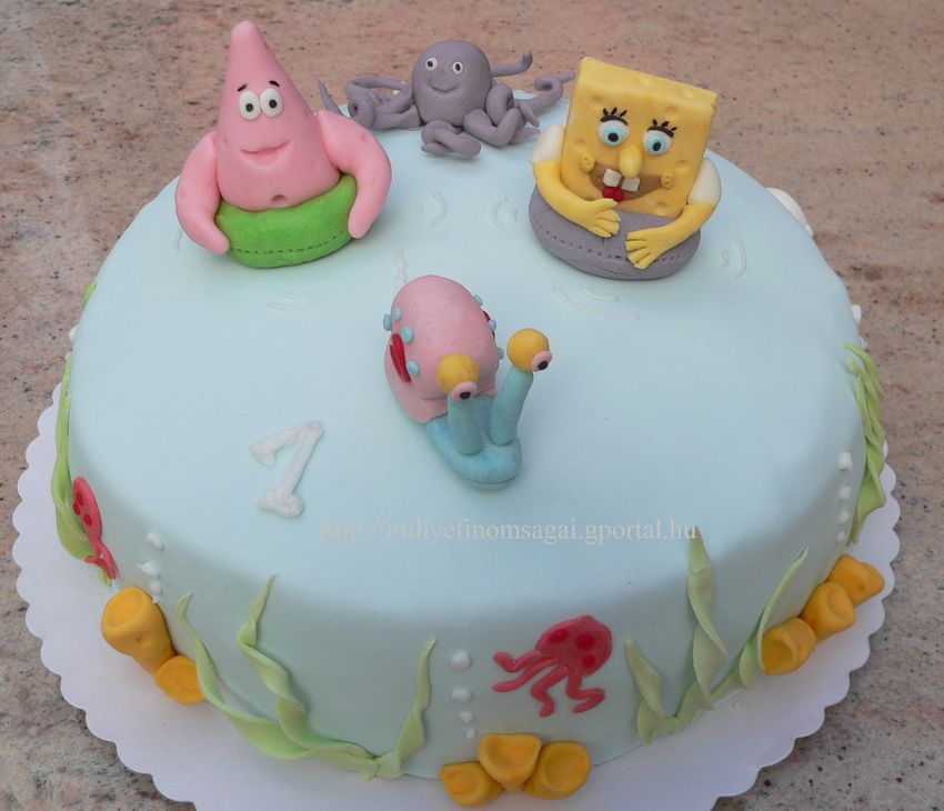 Nagy slger spongyabob mg mindig :) Egy 1 ves kisfi szletsnapjra kszlt ez a torta. Oroszkrmmel tltttem meg. A krs az volt hogy legyen rajta Patrik de a tbbi dsztsben szabad-kezet kaptam. Amikor rm van bzva a dszts akkor remek tleteim tmadnak... kis kedvencemet Csigusz-t is elksztettem s a lemaradhatatlan Spongyabobot is.