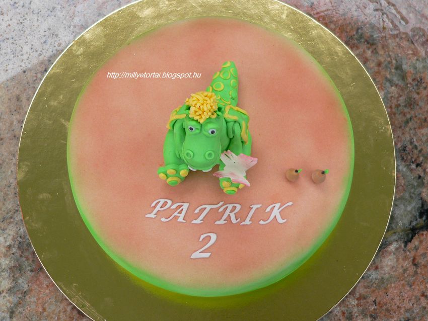 Gyerekkorom kedvenc mesje volt a ss a srkny. A mese egy jindulat srknyrl szl akit az apukja kitagadott. Kedvenc tele a vadkrte s nagyon szereti a lepkket. gy nagyon rltem neki amikor az egyik ismersm megkrt r, hogy ksztsek egy ss a srkny tortt. A torta oroszkrmmel lett  megtltve. A fests ismt airbush-al trtnt. A tortn az a kt "micsoda" vackor (vadkrte) akar lenni :)  Ss kezn egy lepke van.