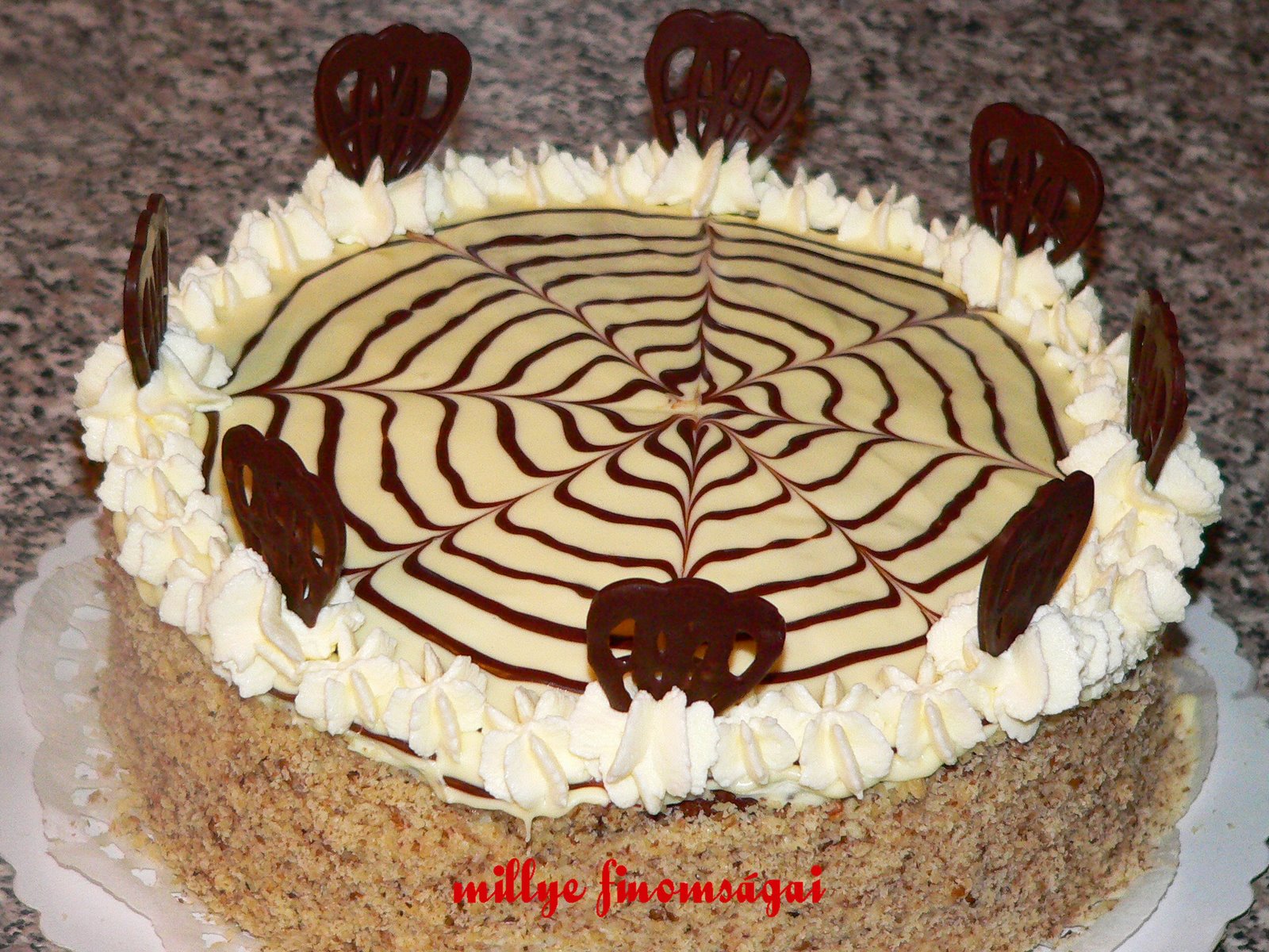 Tulajdonkppen nem sokat vltoztattam rajta az els Eszterhzy tortmhoz kpest csak annyit hogy tejszn helyett vajat kevertem a krmbe, illetve hogy tejsznhabbal s csokifalatkkkal dsztettem ki. Ennl a tortnl miutn kistttem az sszes lapot s a krm is kihlt, a tortaformba tltttem meg a lapokat a krmmel s gy dermesztettem egy estt a htben. Szerintem most jobban sikerlt az Eszterhzy torta jellegzetes rcsos motvumt "belekarcolnom"