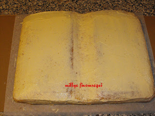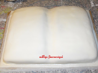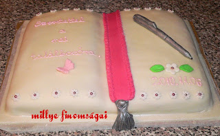 Ezt a tortt (knyv torta) a mini osztlytallkoznkra ksztettem. 4 tojsos lapot stttem amit kettvgtam. Tejsznes fztt krmmel tltttem meg. A tollat s a bojtot ezst szn telfestkkel szneztem. A feliratot dszt cukormzzal ksztettem (tojsfehrje s porcukor valamint telfestk)