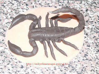 Skorpi-s torta vagyis mit keres egy skorpi a tortn?  :) 3 tojsos lapot stttem amit 3 fel vgtam. Tejsznes trkrmmel tltttem  meg. A tetejre 2 dl felvert tejsznt tettem s darlt keksszel szrtam meg. Az oldalra "csokigallrt" tettem. A skorpi fondantbl kszlt.