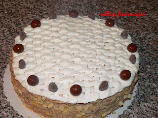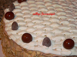 Felmelegtettem 5 dl tejsznt amibe beletettem 1 evkanl instant kvt 4 evkanl porcukrot s jl sszekevertem majd lehtttem. Miutn kihlt felvertem a kvs tejsznhabot s belekevertem 50 deka mascarpone sajtba. Ktfel osztottam az egyikbe belekevertem 1 tbla j minsg olvasztott csokoldt.A pisktt hromfel vgtam. Beletettem tortaformba az els pisktt s megtltttem a kvkrmmel majd utna a kvetkez pisktt tettem r s a csokikrm kvetkezett majd a piskta a tetejre. Betettem pr rra a htbe. Miutn megdermedt megkentem a torta oldalt a megmaradt tejsznes kvkrmmel s megszrtam szeletelt mandulval. A tetejre 2 dl felvert tejsznt tettem valamint mogyors s manduls csokigolyt.
