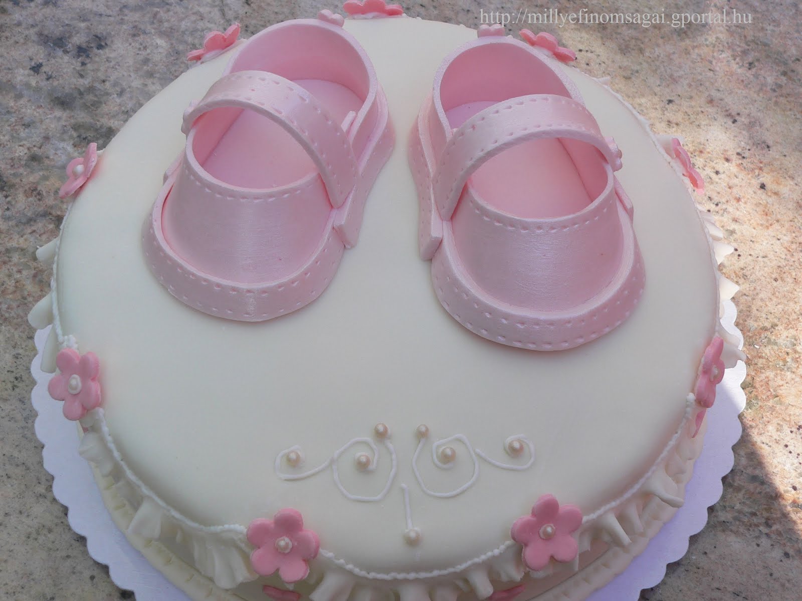 Ez a torta az egyik frumtrsam kislnynak kszlt a kereszteljre. Tejsznes trkrmmel lett megtltve a sima piskta. A torta tetejre rzsaszn kis cipt krt Andi a tbbi dsztst rm bzta. :)  Royal Icinggel "ragasztottam fel a virgokat s a szimblumot is azzal rajzoltam. A torta szlre csipkt ksztettem fondantbl. A kis cip is fondantbl kszlt amit ehet csillmmal festettem le.