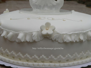 Ezt az eskvi tortt Pter sgoromnak ksztettem s felesgnek Anitnak. A torta sima pisktalapbl kszlt amit tejsznes trkrmmel tltttem meg. A csipkzs elg sok idmet vette el de a vgeredmny magrt beszl. A cukor galambprt Bali vi ksztette nekem amit itt is ksznk neki.