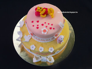 Lolnak mr harmadik ve ksztem a szletsnapi tortjt. Idn a kedvenc mesefigurit krte a tortjra micimackt s Tdd valamint, hogy legyen srga a torta egy rsze. A tbbi dszts rm volt bzva. A torta als rsze tejsznes trkrmmel a fels szint tejsznes csokoldkrmmel lett megtltve. A torta mell ksztettem muffinokat is amiket az emeletes torta alapjn dsztettem hogy meglegyen az sszhang. A muffinok belseje szintn tejsznes csokikrmmel lett megtltve.