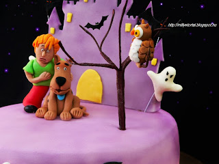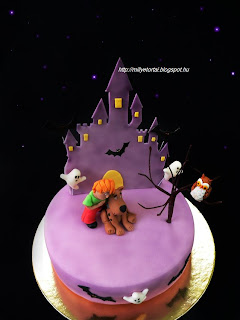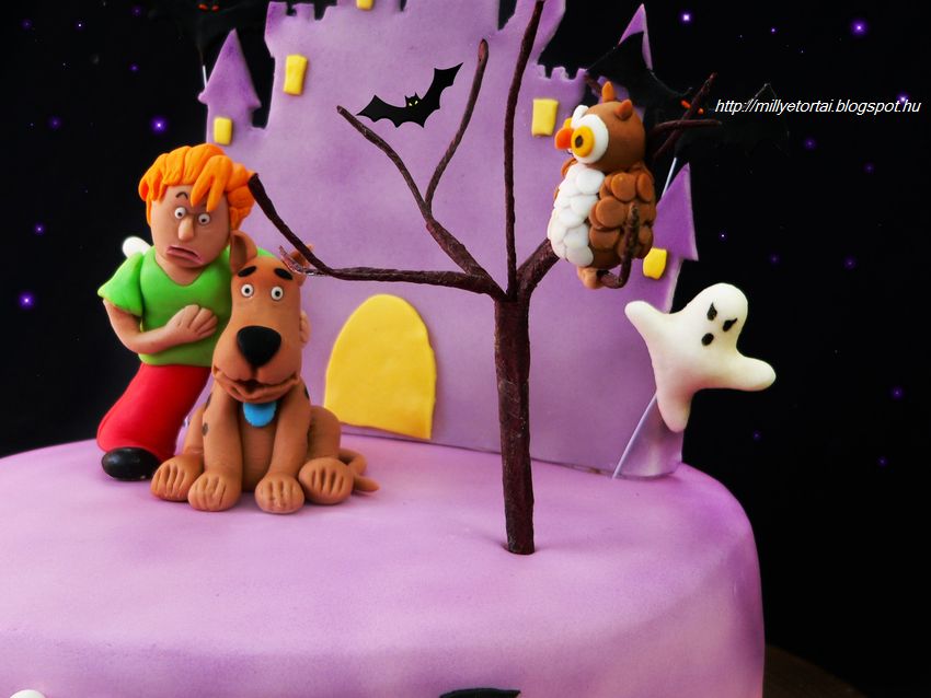 jabb mesehsket formztam meg. Scooby doo a Dn dog s bartja Bozont kerlt a  torta tetejre. Valamint szellemek, denevrek bagoly s a httrben egy szellemkastly. A figurk smartflex dekorcis masszbl kszltek. A fa amin a bagoly csrg virgdrtbl van. A kastlyt cukormasszbl ksztettem. A csokis piskta dobostorta krmmel lett megtltve. A tortt lila airbrush festkkel fjtam le.