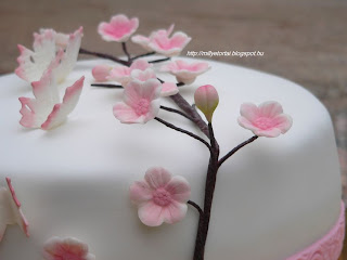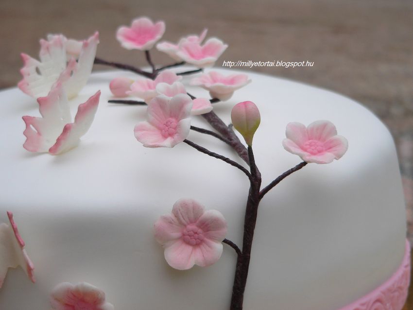 Az j v els tortja amit cukorvirgokkal pontosabban egy egsz cseresznyevirg ggal s pillangkkal dsztettem. Nem sok idm volt r mert ksn jtt a felkrs s ezrt is dntttem gy hogy cseresznyevirgot ksztek. A torta tejsznes trkrmmel lett megtltve.