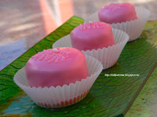 Gyrgyitl kaptam pr hete tesztelsre egy kil fondant. Ma vgre eljutottam odig hogy kiprbljam. Maradt egy nagy adag pisktm, gy gondoltam, hogy mignont ksztek. Fztt/vajas csokikrmmel tltttem meg a pisktkat, majd fnkszaggatval kerek formkat szrtam ki belle, vkonyan megkentem felhabostott vaj/porcukor/vanlis cukor egyveleggel s betettem a htbe dermedni. Addig a fondant gz felett folyamatos kevers mellett 40 fokra melegtettem, majd piros telfestkkel megfestettem. A piskta "korongokat" rcsra tettem s rntttem a fondant. Egy evkanl fondant nyomzskba tltttem s a mignonok tetejt "bercsoztam". Mindegyik mignon tetejre cukorgyngyt tettem, miutn kihlt betettem a htbe.  Tapasztalatom a kvetkez: Knny vele dolgozni, jl terl, nagyon knnyen sznezhet (wilton zsels telfestkkel szneztem)  Felhasznlhatsga sokrt. Ksztettem stinyalkt is amit a fondantba mrtottam onnan pedig cukorgyngybe hempergettem. A kedvenc tortmat (Eszterhzy) is el tudom majd kszteni vele. rkzni is tkletes :)