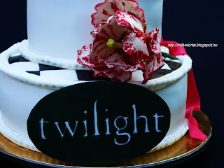 Az els Twilight tortm. reztem, hogy el fog jnni az id amikor elkszthetem. Aki nem tudja  annak lerom, hogy a Twilight egy ngy ktetbl ll vmpr romnc, fantasyregny-sorozat. A knyvek bortjn klnbz szimblumok vannak ezek kerltek r a tortra. Az Alkonyat az els rsz amin egy piros almt fog kz van. Az jhold a msodik rsz amin egy fehr-vrs tulipn lthat. A harmadik ktet a Napfogyatkozs aminek a bortjn egy vrs szalag lthat. A negyedik knyv a Hajnalhasads aminek a bortjn egy sakktbla van egy piros gyaloggal s egy fehr kirlynvel. Az alma kekszmasszbl kszlt amit leburkoltam s airbrush segtsgvel fjtam pirosra. A tulipn drtos virgtechnikval kszlt. A piros sakk bb marcipnbl kszlt a fehr pedig csokoldbl. A torta als rsze tejsznes csokikrmmel lett megtltve a fels rsz tejsznes trkrmmel. A twilight tbla cukormasszbl kszlt.