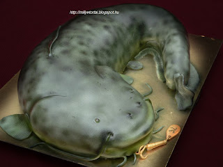 Harcsa tortt ksztettem legalbbis valami hasonlt  egy nagy horgsznak. A tortzson kvl a msik hobbim a horgszat s volt mr szerencsm lben is tallkozni harcsval. :)  Mgsem mondom hogy egyszer dolgom volt amikor meg kellett formznom ezt a "jszgot" . Cukormasszbl ksztettem egy horgot pergetvel amit lszterfestkkel festettem le. A harcsa tortt tejsznes trkrmmel tltttem meg. Farags s burkols utn airbrush-al festettem le a harcst.  Legkzelebb (mr ha lesz ilyen) mr tudom mi az amit mshogy fogok csinlni. J lett volna pr fzis fott kszteni a munkafolyamatrl, de a nagy kapkodsban ez is elmaradt. A fotzsnl az es s a borongs id is bezavart gyhogy az sem lett valami j minsg.