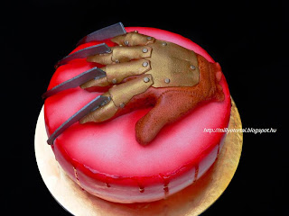 Freddy Krueger kitallt szerepl a Rmlom az Elm utcban cm horrorfilmbl. egy eltorzult arc, pengs kesztyvel elltott sorozatgyilkos aki rmlmaikban vgez ldozataival. Hozzm mg mindig a rzsaszn, babs, virgos, cuki tortk llnak kzel, egyszval nem a szvem cscske tortt ltjtok most. Konkrt kp alapjn ksztettem el amit a szletsnapos mentett le egy klfldi oldalrl. A torta tejsznes trkrmmel lett megtltve. A keszty kekszmasszbl kszlt amit szintn leburkoltam, utna jttek r a kiegsztk. A kesztyt s a tortt airbrush-al festettem le, a keszty tbbi rszt egy ecset segtsgvel (penge s egyebek) alkoholba feloldott lszterfestkkel. A "vr"pirosra festett hidegzsel.