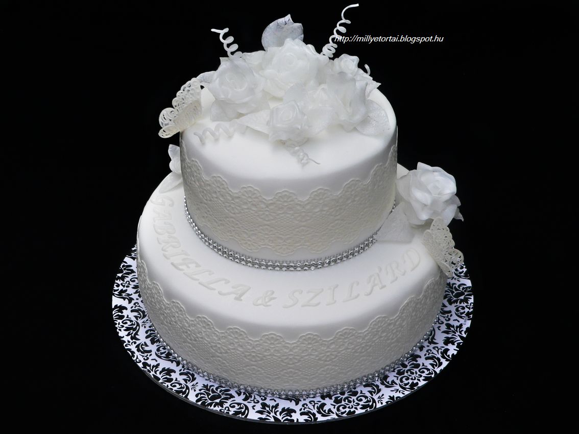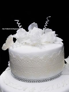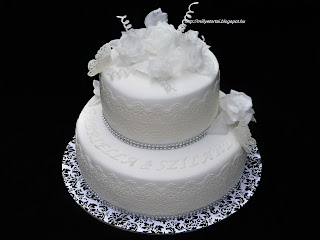 Szeretem az eskvi tortkat mert elegnsak, kifinomultak s szemlyre szabottak. Imdtam elkszteni ezt a tortt is. Hzott cukorbl kszltek a karamell rzsk. Mg mindig meleg a kezemnek a karamell viszont csodkat lehet vele kszteni. Remlem ebben az vben el tudok menni tanfolyamra ahol elsajtthatom ezt a mestersget. De  trjnk is vissza a tortra. Az als szint karamellkrmes krm volt karamellizlt pirtott dival. A fels szint dobostortakrmmel lett megtltve. A torta oldalt cukorcsipkvel s ezst gyngyszalaggal dsztettem.