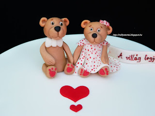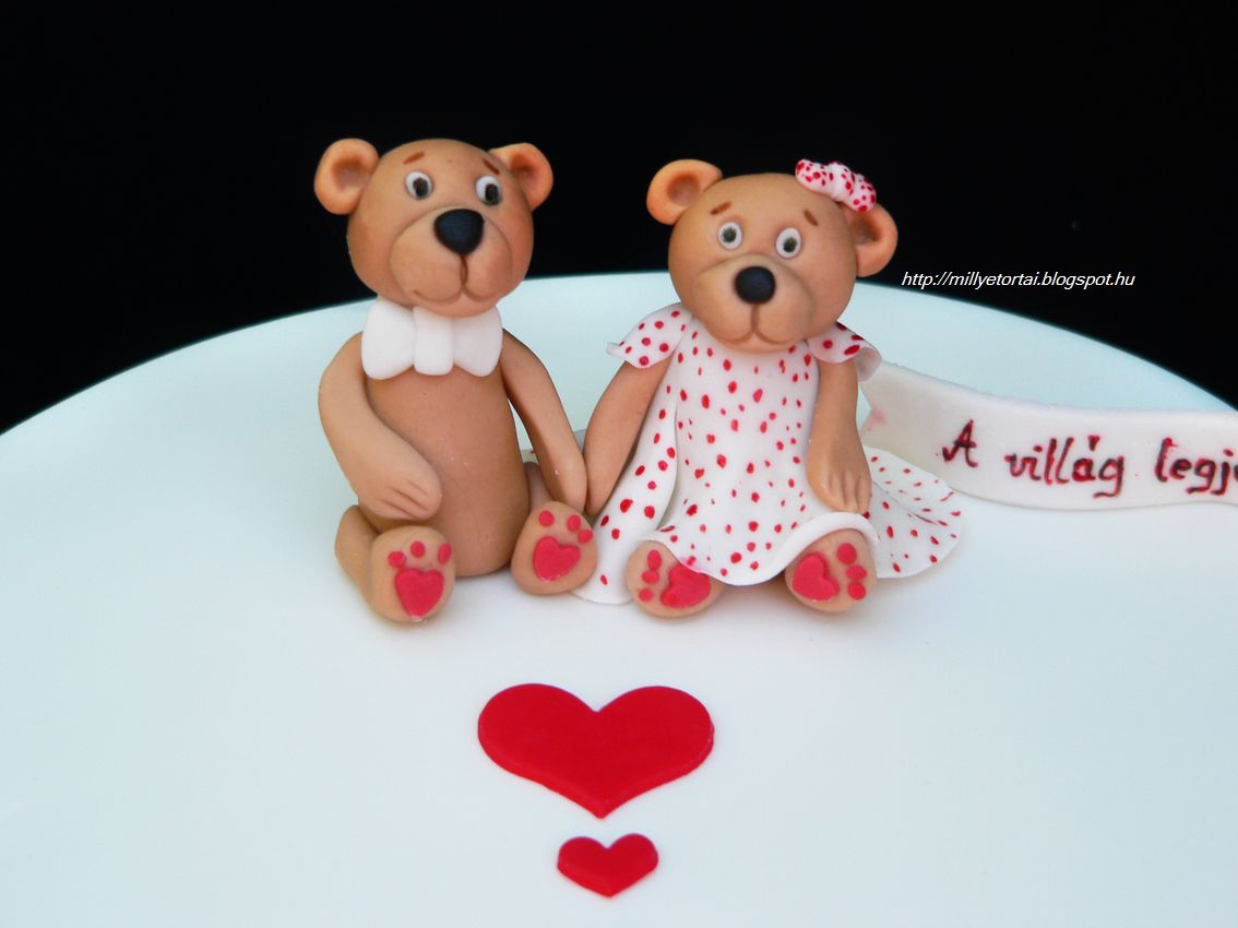 Szerintem nem csak gyerekeknek a tortjra lehet macit tenni. Szinte minden korosztly rl  ha macival dsztett tortt kap. A macipr nnem egyedre piros-pttys ruhcska is kszlt. Hagyomnyaimhoz hven cukorcsipkvel dsztettem a torta oldalt. A tltelk pedig tejsznes trkrm ropogs csokirteggel.