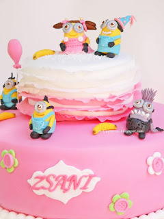 A fis minyon torta utn jjjn egy lnyos verzi :)    Nlunk is dl a minyon lz. A hten kezddtt a mozikban a Minions,  ajnlom mindenkinek. Nagyon cuki kis mese :)  Visszatrve a tortra. A tltelke csokikrm s tejsznes krm (eperdarabokkal) Vanlis s csokis pisktval. A figurk cukormasszbl kszltek. A tortra a figurkon kvl kerlt fodor s virgok is.