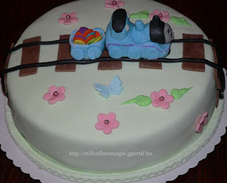 Ez a msodik mozdonyos tortm. A tortalap kakas pisktalapbl kszlt. Fztt csokikrmmel tltttem meg. A mozdony s a borts fondantbl kszlt. A sn s a virgok marcipnbl.