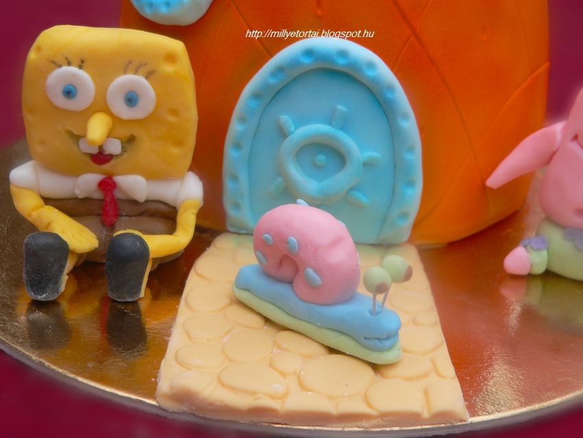 "Valahol a Csendes-cen mlyn, annak egy be nem hatrolhat szegletben ltezik egy vros: Bikini-fenk. Ott ldegl egy ananszban SpongyaBob Kockanadrg (egy tengeri szivacs) akinek Patrik a tengeri csillag a legjobb bartja. Spongyabobnak hzillata is van: csigusz.... " Nos me a msik spongyabobos torta.  Annyi vltozs van a kevereds miatt, hogy csigusz helyett Tunyacsp kerlt vgl erre a tortra, de errl a cserrl mr nem kszlt fot. A torta fztt csokikrmmel lett megtltve amit dermeds utn anansz szerre faragtam. A szp narancssrga sznt airbrush-al fjtam r. Httrnl is fotztam, de valahogy gy utlag nzve a bord httr nem nagyon illik a narancssrghoz :)