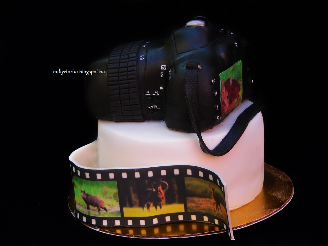 Egy vadsznak kszlt ez a torta. A fotzs a hobbija gy a tma adott volt. Az als tortra krbe s kacskaringzva erdei fotk kerltek cukorlapbl. A fnykpezgp-torta s az als szint is tejsznes trkrmmel lett megtltve ami kz ropogs csokirteget tettem.