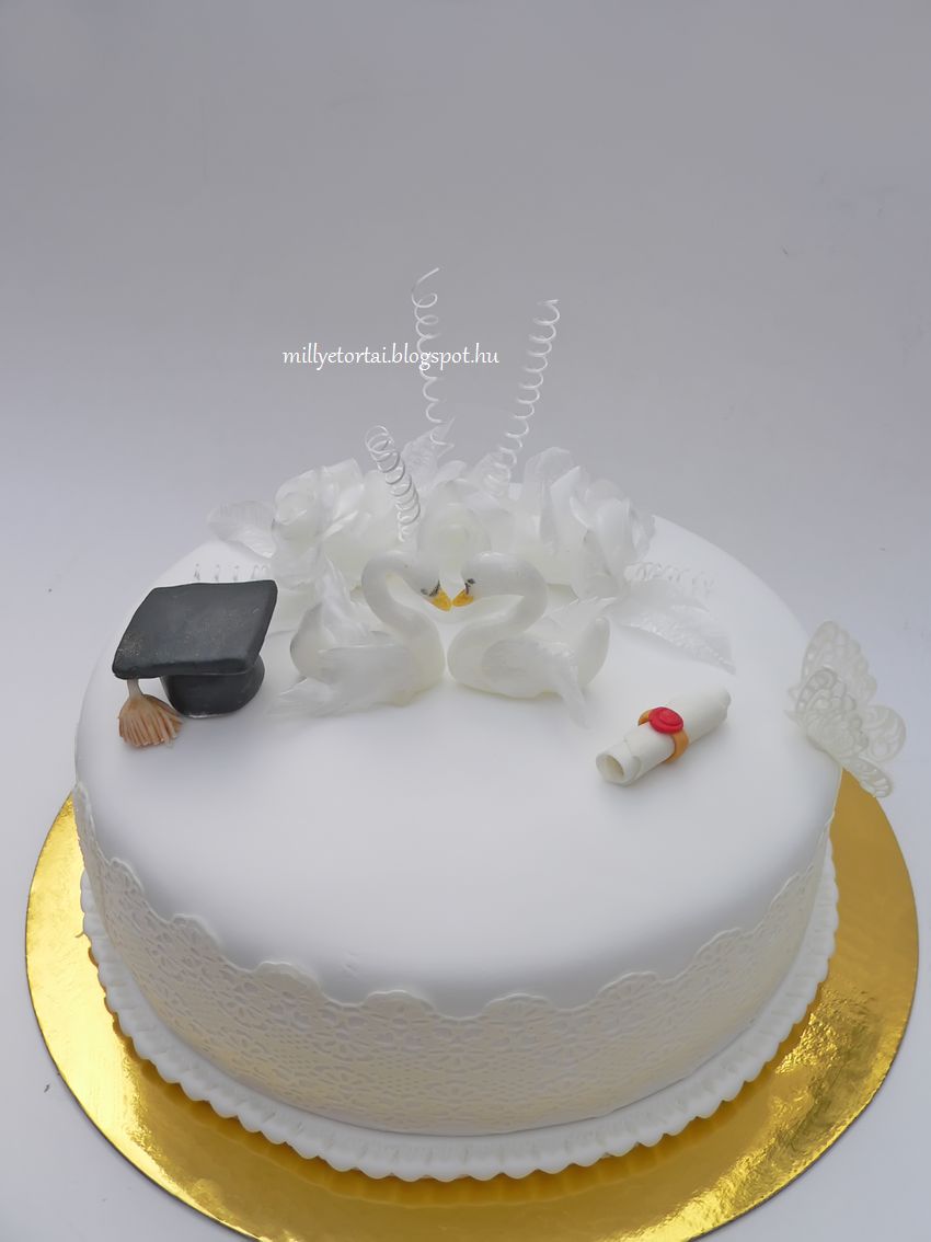 Egy diplomaosztval egybekttt eljegyzsi torta kszlt. Igazbl egy sikeresen megszerzett diploma miatt tartottak egy kis csaldi sszejvetelt s a meglepets az eljegyzs volt. :)  A piskta oroszkrmmel lett megtltve. A torta oldalt cukorcsipkvel dsztettem a tetejre karamell rzskat spirlokat s egy szerelmes hattyprt tettem amit karamellbl ksztettem. Kszlt mg egy paprtekercs s egy fekete diploma kalap is, ez az utols kpen szerepel.