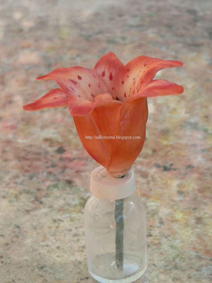 Elkszlt az els virgdrtos nagy cukorliliom. Sajnos a fotn nem ltszik sem az, hogy mennyire leth s az sem, hogy milyen hatalmas. A virg tmrje 19 cm s egy-egy szirom hosszsga12 cm. A virgot Airbrush-al fjtam le s utna porfestkkel tettem mg lethbb. Ahogy elkszlt mr tudtam, hogy mi az amit legkzelebb mshogy csinlok. Pl a kzps bibe tl tmzsi a virgszirmok vastagok... de mr szrad a kvetkez adag amiket sikerlt paprvkonysgra nyjtanom.