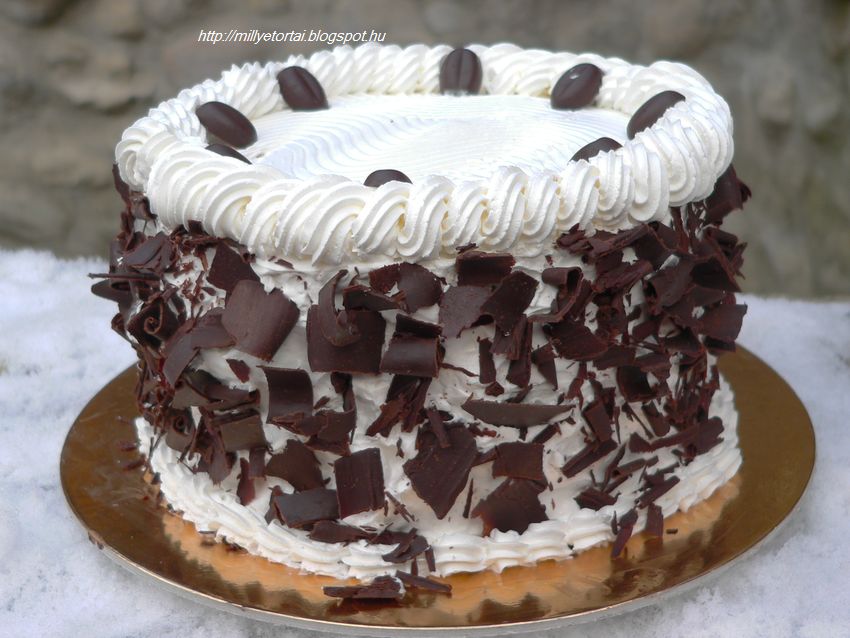 A tejsznt a habfixlval s a porcukorral kemny habb verjk s megkenjk vele a torta tetejt s oldalt. Fskrtyval elsimtjuk s cskozzuk. A tetejre habrzskat nyomunk. A torta oldalra csokiforgcsot szrunk.