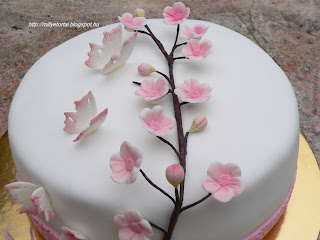 Az j v els tortja amit cukorvirgokkal pontosabban egy egsz cseresznyevirg ggal s pillangkkal dsztettem. Nem sok idm volt r mert ksn jtt a felkrs s ezrt is dntttem gy hogy cseresznyevirgot ksztek. A torta tejsznes trkrmmel lett megtltve.